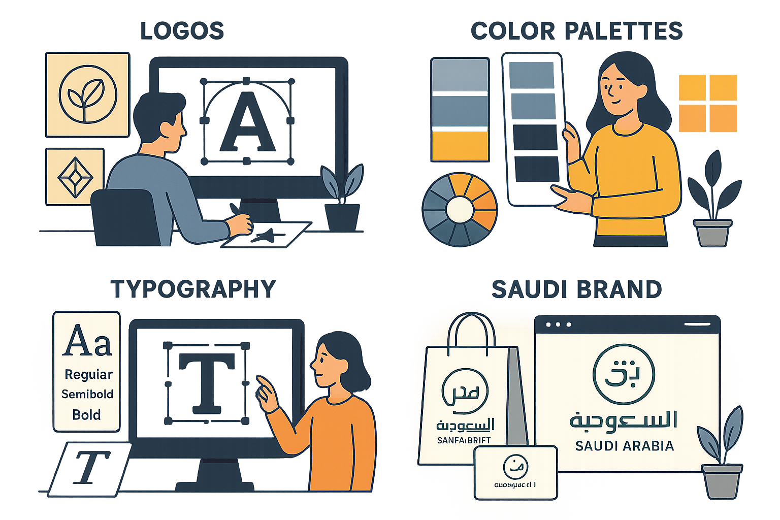 - إن كان جمهورك محليًا (في السعودية مثلًا)، فالأفضل أن تكون هوية بصرية باللغة العربية.